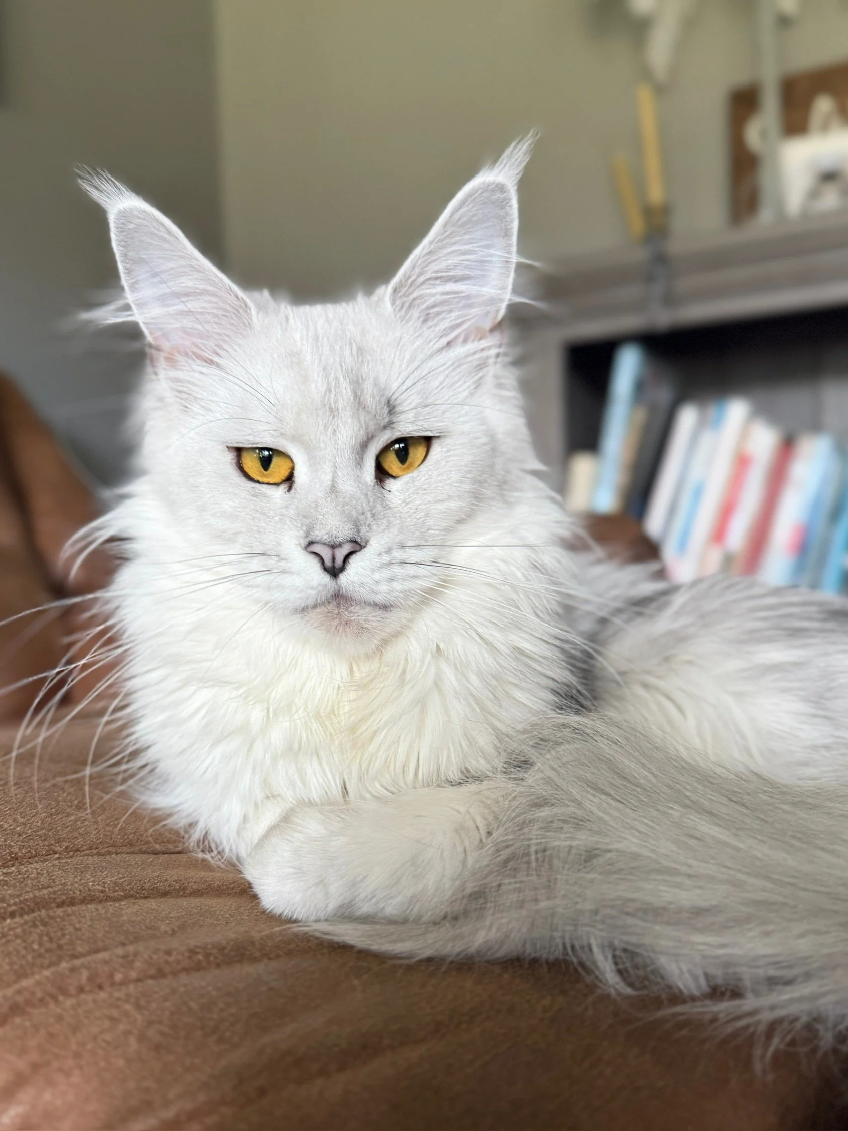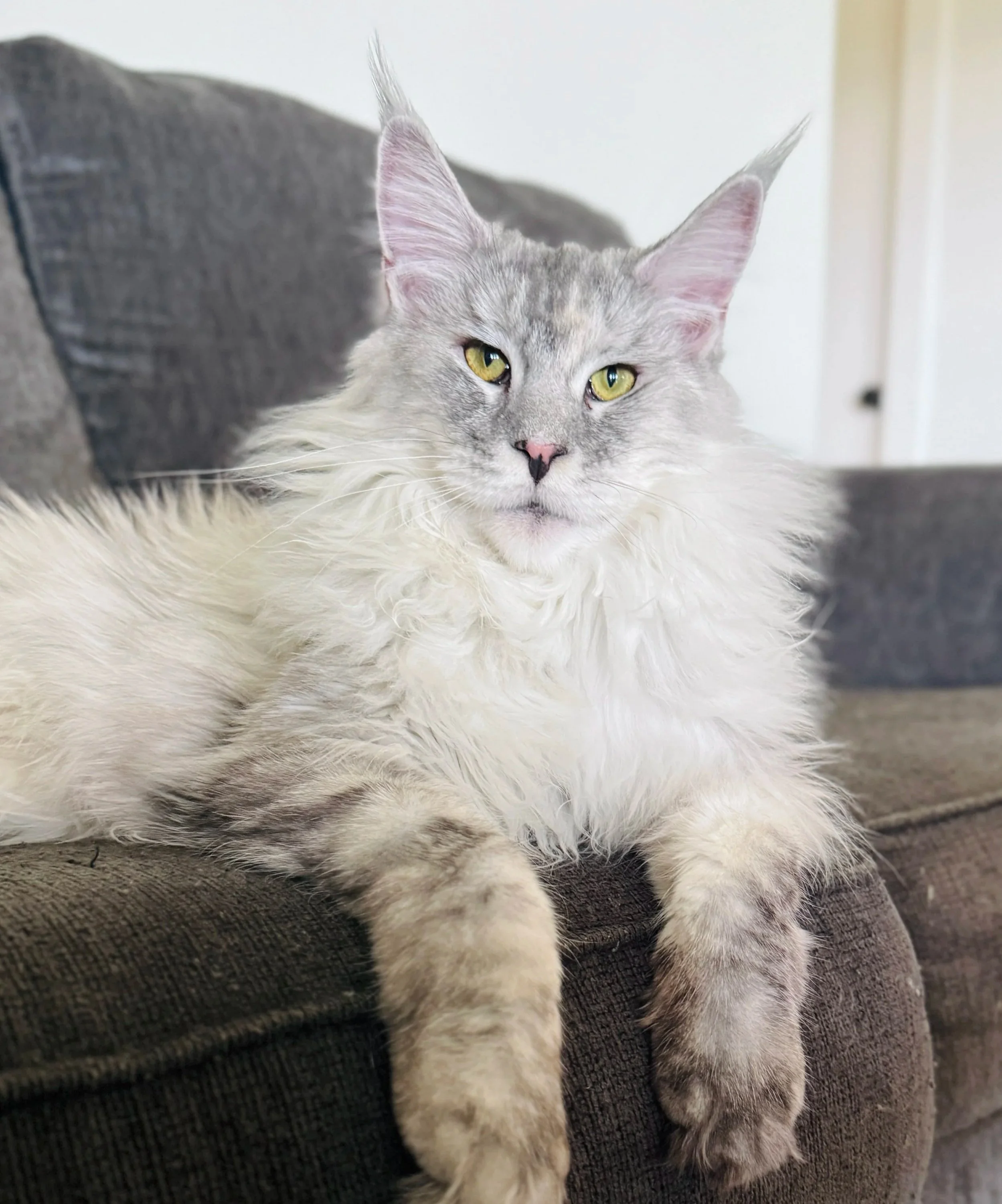This is a fabulous blue smoke girl born in our home. Her litter name was Valentina so we spun it to “Valley Girl” with her sweet and sassy self. She is a confident girl that always knows what she wants. She has an amazing type: beautiful elongated face, high ear set, distinct tufts, great fur quality, and good structure. Can’t wait for her future babies!